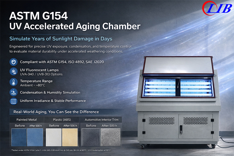 Industria LIBOfrece cámaras de prueba de envejecimiento ASTM G154 de alta precisión diseñadas para mayor durabilidad, estabilidad y personalización. Las ventajas clave incluyen: