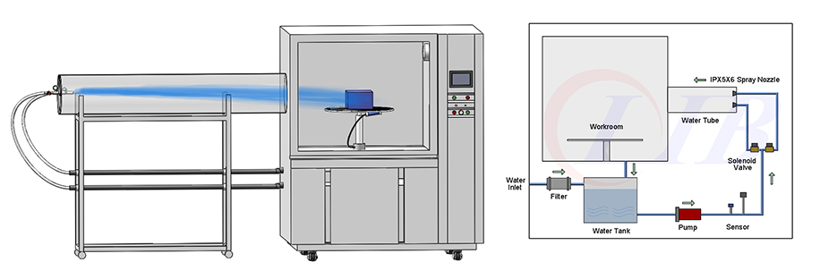 Prueba de pulverización de agua IPX6K: Simula la pulverización de agua de alta presión a 800-1000 kPa.