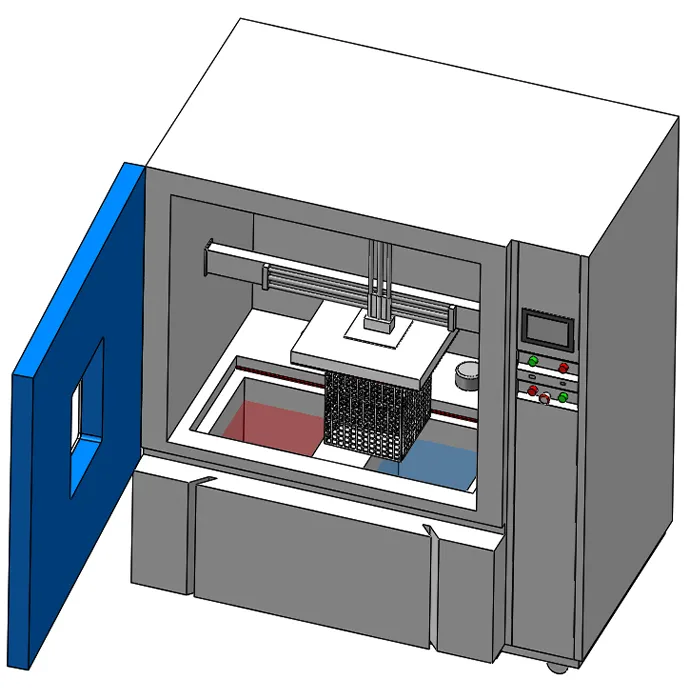 | Cámaras calientes y frías | Tanques de líquido independientes con control de temperatura preciso. La alta uniformidad térmica asegura que cada superficie de la muestra experimente la misma tensión. Construido con materiales resistentes a la corrosión para manejar aceites, fluidos fluorados o líquidos corrosivos. |  |