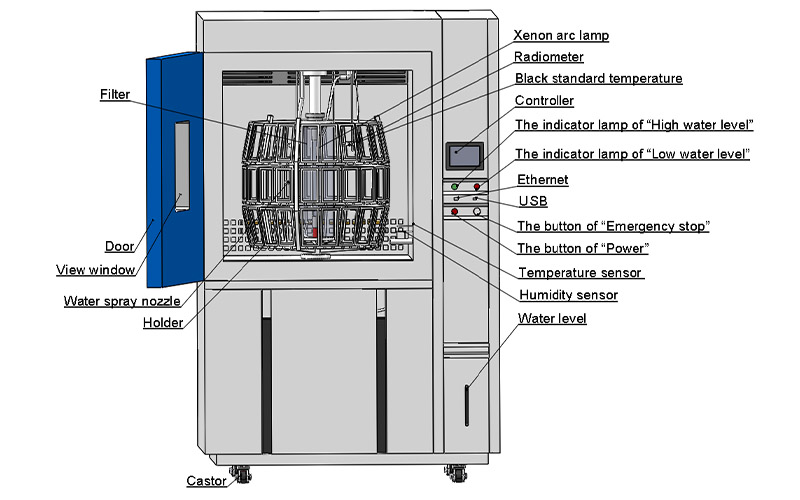 Normas compatibles: ISO 105-B02, ISO 4892-2,ASTM G155, ASTM G26, ASTM G151,IEC 60068-2-5, IEC 60068-2-27,ISO 105-B04 (EN) (DIN)