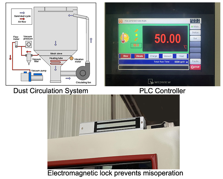 3.Pruebas:Ejecute la prueba durante 2-8 horas, monitoreando el flujo de aire y la concentración de polvo continuamente. Los sensores dentro de la Cámara confirman la densidad de partículas y el movimiento.